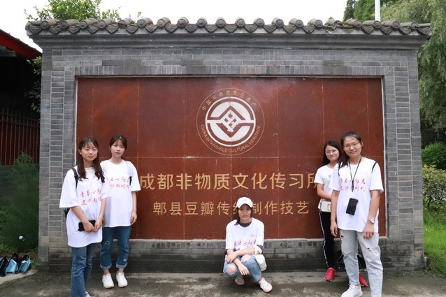 郫县豆瓣是四川省郫县特产,是川味食谱中常用的调味佳品,有“川菜之魂”之称,其制作技艺列第二批国家级非物质文化遗产名录。首先,战旗村工作人员带领全体成员参观郫县豆瓣博物馆,馆中陈列的早期豆瓣酱制作工具、人物雕塑,真实的还原了早期豆瓣酱的制作过程,但是繁琐的制作流程和落后的工具使农村经济发展缓慢。之后,工作人员人带领团队成员参观现代郫县豆瓣制作工厂,现代工厂充分将现代科技与人文传承技术相结合,厂内酱缸排列整齐,精密的智能测温器能够让制作人员更好的把控豆瓣酱的制作,这使豆瓣制作效率得到极大提升,同时也促进了当地的经济发展,现代化的制作流程让团队成员体会到了农产经济与时代科技创新相结合的现实意义。