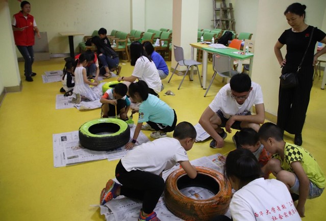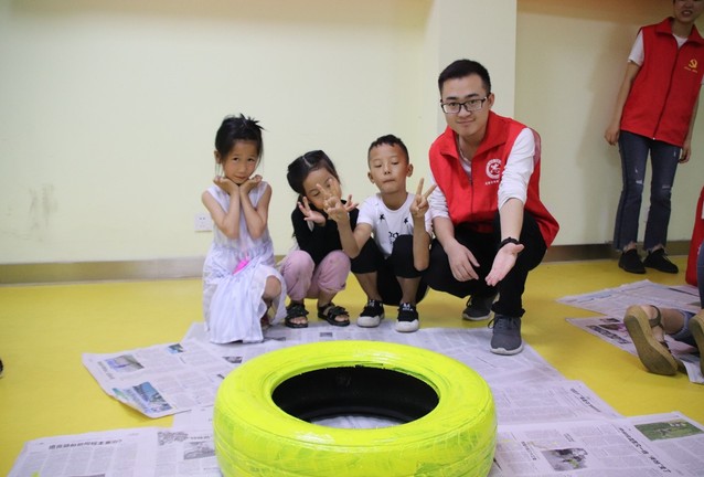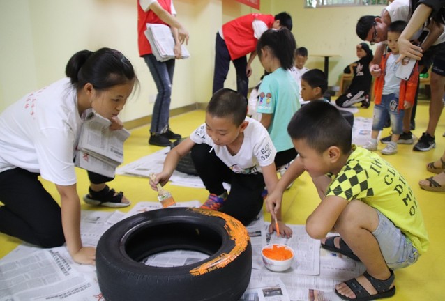 下午2点,队员为轮胎改造活动以为次日绿化活动做准备。小朋友们将五颜六色的颜料涂画在轮胎上,将破旧、黢黑的轮胎变得五彩斑斓。活动让他们在玩乐的过程中尽情发挥自己的想象力,以培养他们的创新思维。