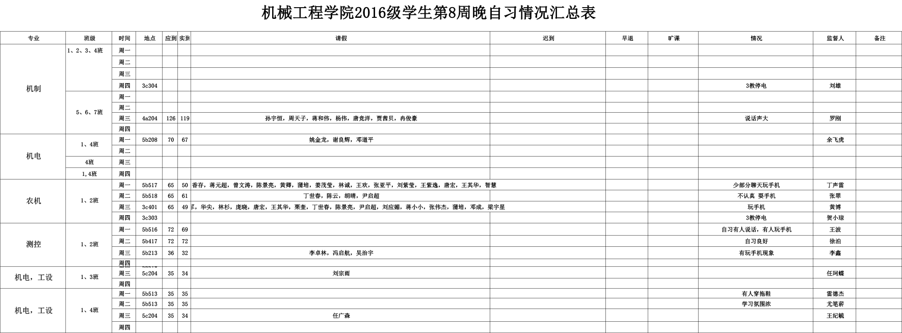 【考勤公示】2016级第八周晚自习情况汇总表