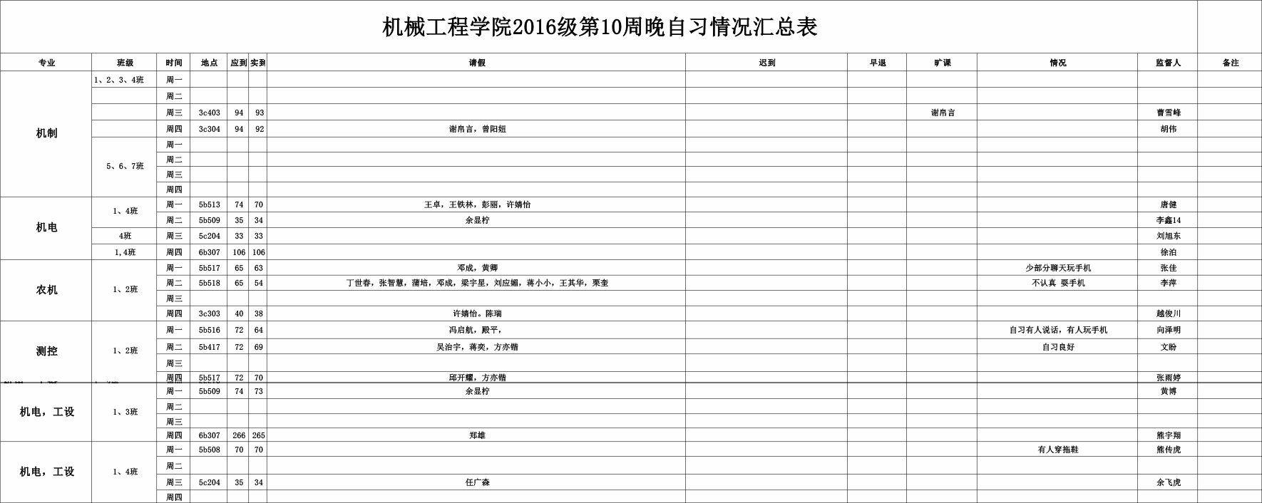 【考勤公示】2016级第十周晚自习情况汇总表