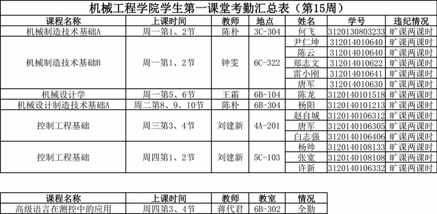经学院学生党务工作站对学院学生第一课堂出勤情况的考察,现将学生第一课堂(第十五周)的出勤情况公示如下:
