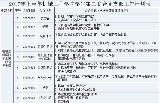(2)支部委员会。每月召开一次,主要内容是分析支部党员队伍状况,制订教育管理措施,讨论发展党员工作等问题,检查总结支部自身建设情况,提出下一阶段整改意见。
