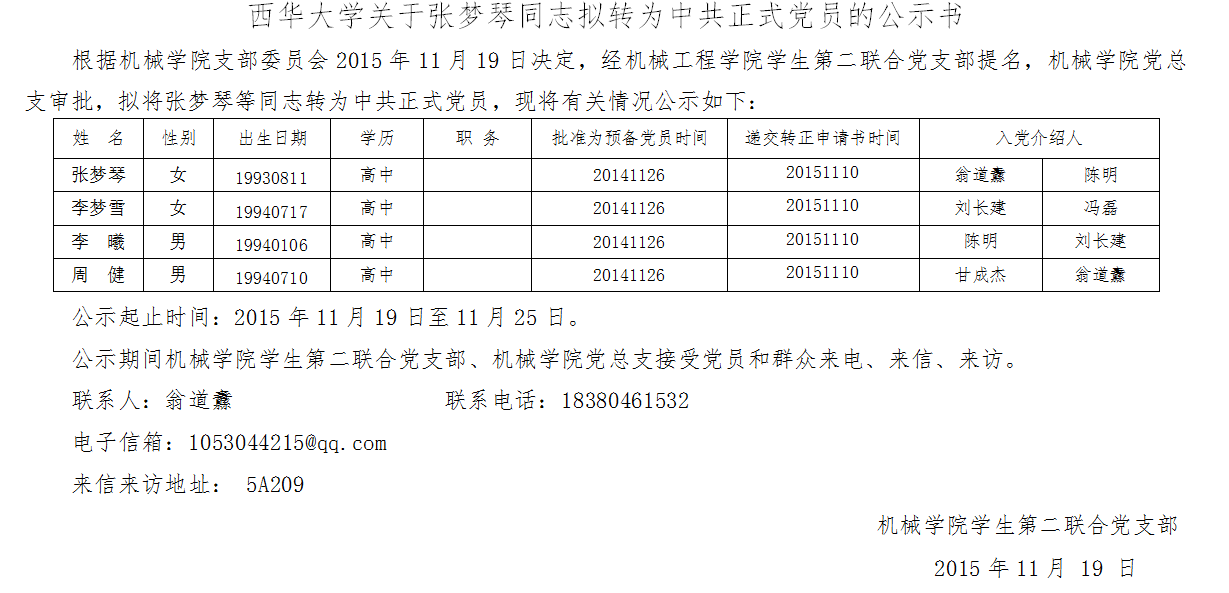 【公示公告】西华大学关于张梦琴、李梦雪等4位同志拟转为中共正式党员的公示书