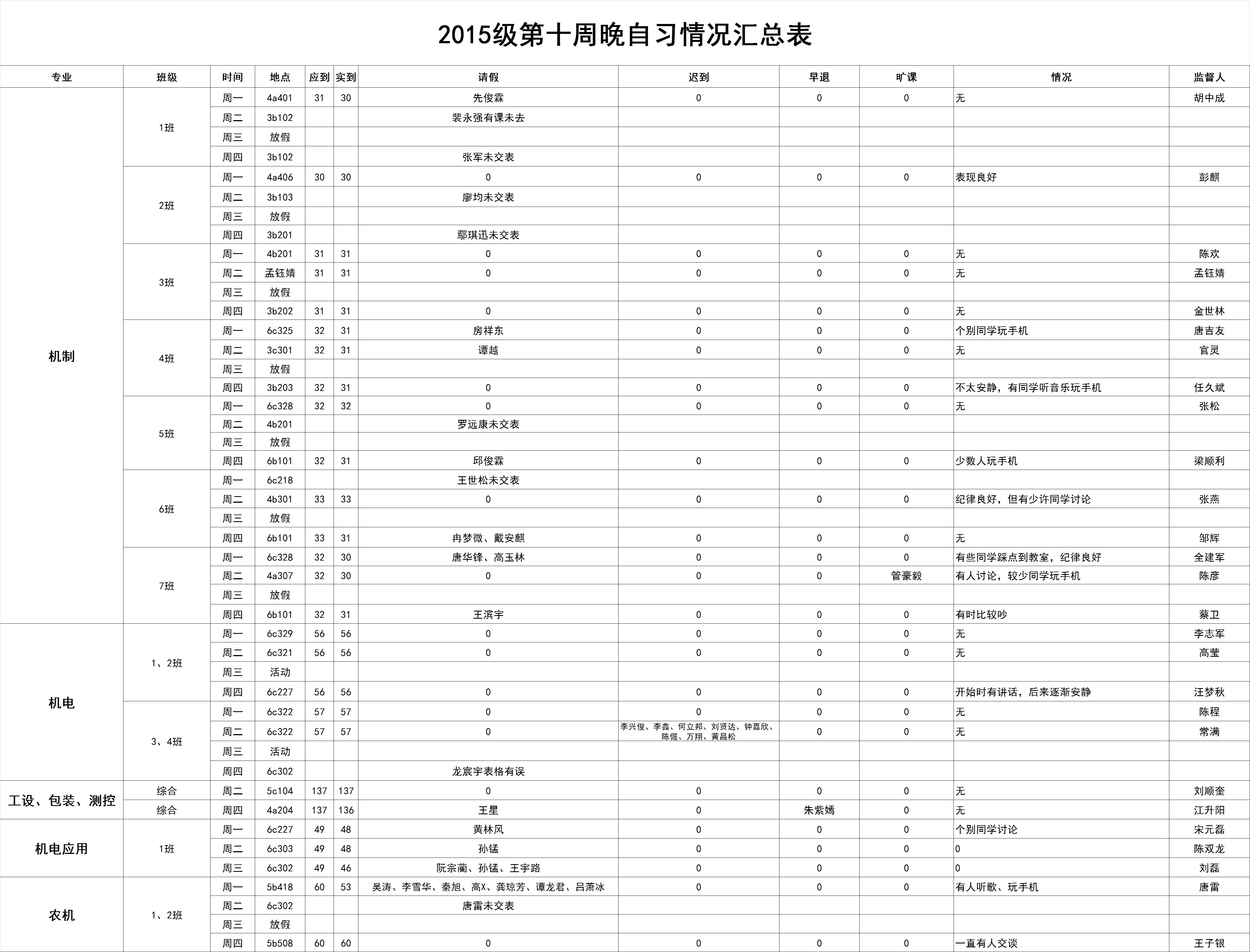 【考勤公示】2015级第十周晚自习情况汇总表