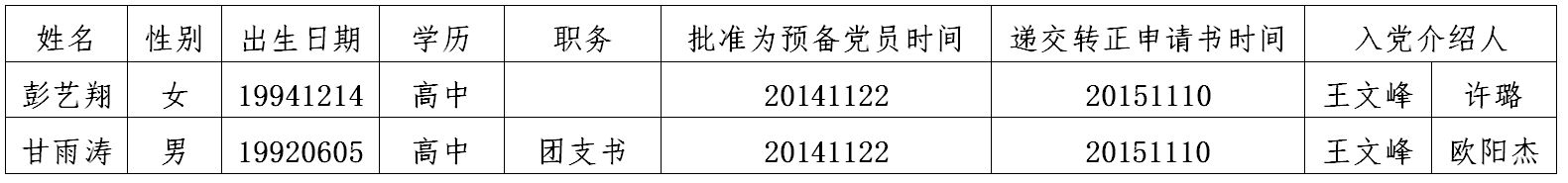 点击:244 根据机械学院支部委员会2015年11月15日决定,经机械学院学生第三联合党支部提名,机械学院党总支审批,拟将彭艺翔、甘雨涛同志转为中共正式党员,现将有关情况公示如下: