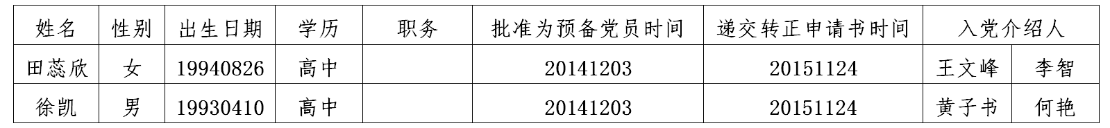 点击:291 根据机械工程学院支部委员会2015年11月24日决定,经机械工程学院学生第三联合党支部提名,机械工程学院党总支审批,拟将田蕊欣、徐凯同志转为中共正式党员,现将有关情况公示如下:
