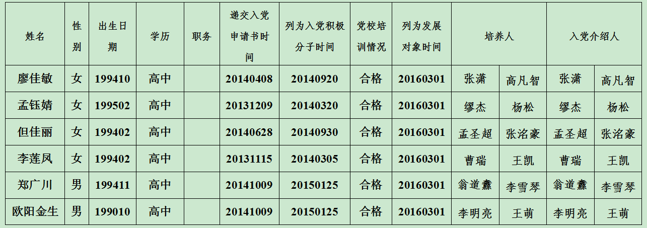 点击:160 根据机械学院支部委员会2016年5月3日决定,拟于近期讨论接收廖佳敏、孟钰婧、但佳丽、李莲凤、郑广川、欧阳金生同志为预备党员,现将有关情况公示如下: