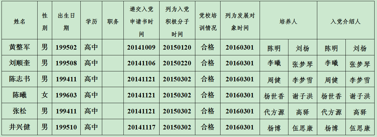 点击:152 根据机械学院支部委员会2016年5月4日决定,拟于近期讨论接收黄整军、刘顺奎、陈志书、陈曦、井兴健、张松同志为预备党员,现将有关情况公示如下: