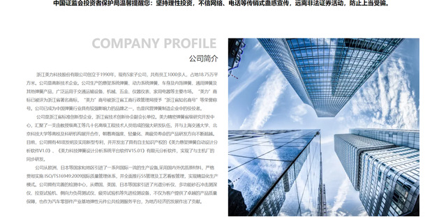 点击:465 公司创立于1990年,2017年在深交所创业板上市,成为中国弹簧行业第一家A股上市的企业。下辖浙江美力汽车弹簧有限公司、绍兴美力精密弹簧有限公司、长春美力弹簧有限公司、上海科工机电设备成套有限公司及北美美力有限公司。公司主要生产汽车悬架弹簧、汽车稳定杆、气门弹簧、热卷重型弹簧、弹性冲压件、座椅弹簧、精密注塑等产品。