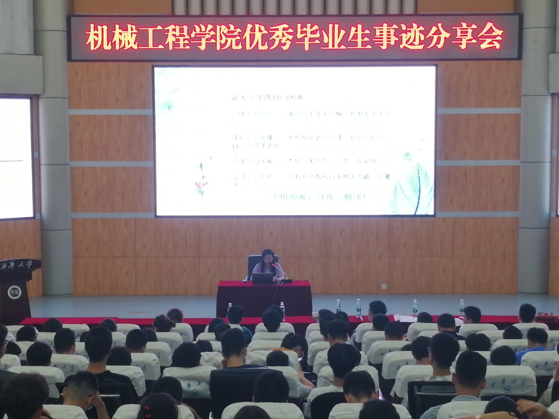 此次会议邀请了学院各专业优秀毕业生共7名,他们分别是来自包装工程专业的刘敏、机械电子工程专业的何立邦、测控技术与仪器专业的向泽明、机械设计制造及其自动化专业的文盼和伍立扬、农业机械化及其自动化专业的吴凯、工业设计专业的于奕苗。会上,作为优秀毕业生代表,7名2015级学生分享了自己在西华大学的四年学习生活、相关见闻,以及取得的学业成果。同时,也鼓励在座的学弟学妹明确目标,坚持不懈,迎难而上;走出寝室,参加社团活动或是加入学生会以及专业实验室,开阔自己的眼界,丰富自己的见闻,参加和专业相关的各种比赛,提升自己的专业技能。分享会的提问环节上,参会学生积极踊跃地提出问题,分享嘉宾用自身经历予以解答。